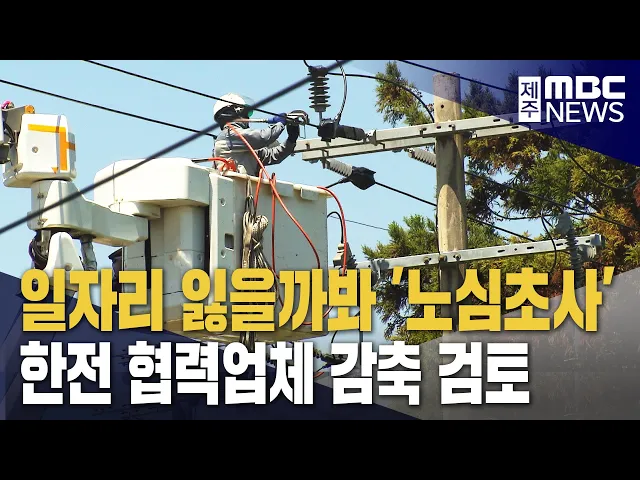 ◀ 앵 커 ▶제주에 있는 전봇대 전선들은한국전력의 협력업체들이 설치와 보수를 맡고 있는데요. 한전이 내년부터 협력업체 감축을 검토하면서100명이 넘는 노동자들이일자리를 잃을까 노심초사하고 있습니다. 이따끔 기자가 취재했습니다.◀ 리포트 ▶사다리차에 올라타전봇대 전선을 교체하고 있는 노동자들. 한국전력과 계약...