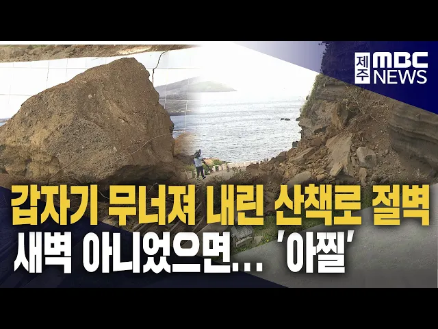 ◀ 앵 커 ▶천연기념물이자유네스코 세계지질공원 지역인제주 수월봉 지질트레일 코스에서또다시 절벽이 무너지는 일이 발생했습니다.무너진 절벽이 산책로까지 덮치면서 자칫 큰 사고로 이어질 뻔했습니다. 이따끔 기자가 보도합니다.◀ 리포트 ▶해안을 따라 이어진 절벽이마치 폭탄을 맞은 듯 움푹 패었습니다.떨어져 나온 ...