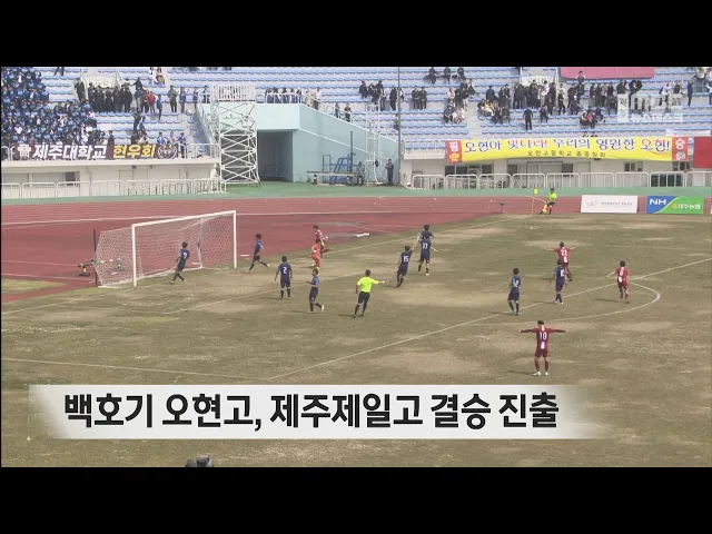 2024 백호기 전도 청소년축구대회에서오현고와 제주제일고가고등부 결승에 진출했습니다. 오늘 제주종합경기장에서 열린고등부 준결승전에서오현고가 대기고를 2대 1로,제주제일고가 서귀포고를 3대 0으로 누르고 결승에 올랐습니다. 제주MBC는 내일(24일) 오후 1시부터 열리는오현고와 제주제일고의 결승전을TV와 유튜브 ...