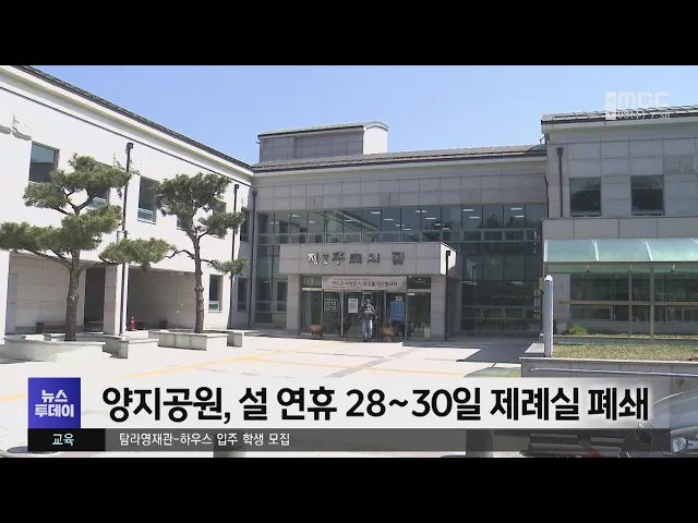 설 연휴 기간 양지공원의 제례실이 문을 닫습니다. 제주도는 설 연휴 기간 2만 명 이상이 양지공원을 찾을 것으로 예상됨에 따라 안전한 추모 환경을 조성하기 위해 오는 28일부터 30일까지 사흘 동안 봉안시설 제례실을 폐쇄합니다. 또 개인별 추모 시간은 5분 안팎으로 제한하며 양지공원 진입 구간 교통 통제도 이뤄집니...