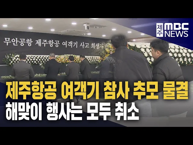 ◀ 앵 커 ▶ 제주항공 여객기 참사 희생자들을 애도하기 위한 합동분향소가 제주에도 마련됐습니다. 추모객들의 발길이 이어진 가운데, 연말연시 해넘이, 해맞이 행사는 모두 취소됐습니다. 이소현 기자입니다. ◀ 리포트 ▶ 하얀 국화꽃이 놓인 단상 앞에 꽃을 올리고 향을 피웁니다. 두 손을 가지런히 모으고 고개를 숙이며 ...