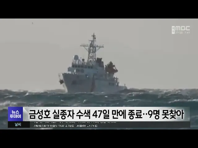 9명이 실종된 금성호 침몰 사고에 대한 수색작업이 47일 만에 종료됐습니다. 제주해양경찰서는 수색에 총력을 다했지만 아직 발견되지 않은 실종자가 있어 마음이 아프고,0 가족들에게 깊은 위로의 말씀을 전한다며 지난 24일 오후 6시를 기해 수색을 종료했다고 밝혔습니다. 선원 27명이 타고 있던 금성호는 지난달 8일 새...