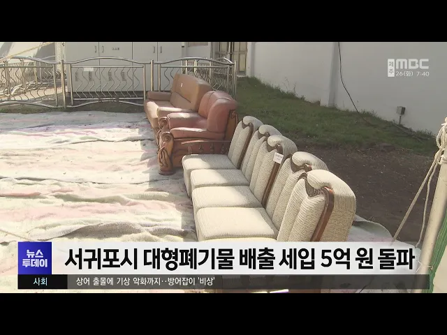 서귀포시의 대형 폐기물 배출이 늘면서 배출 세입이 처음으로 5억 원을 넘어섰습니다. 서귀포시에 따르면, 지난달 기준 대형폐기물 배출 세입은 5억 200만 원으로 지난해보다 13.1% 증가했습니다. 배출 건수도 9만 7천여 건으로 9.2% 늘었는데, 지난해 대형폐기물 배출 폼목이 두 배 이상 늘면서 배출 건수와 세입이 증가한...