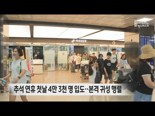 추석 연휴를 맞아 본격적인 귀성 행렬이 시작됐습니다. 제주관광협회에 따르면, 오늘 하루 항공기와 선박을 통해 제주를 찾은 귀성객과 관광객은 모두 4만 3천 명으로 집계됐습니다. 내일은 연휴 기간 가운데 가장 많은 5만 명이 제주를 찾을 것으로 예상됩니다. 한편, 오늘부터 18일까지 추석 연휴 닷새 동안 21만 5천 명...