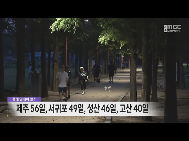 제주 대부분 지역에서 열대야 일수가 관측 이래 역대 최다 기록을 갈아치웠습니다. 제주지방기상청에 따르면 제주는 지난달 15일 이후 47일째 열대야가 이어지고 있는데 이는 관측을 시작한 1923년 이래로 최장 기록입니다. 또 올해 열대야 발생 일수도 제주가 56일로 역대 가장 많습니다. 성산은 46일, 고산 40일로 이미 ...
