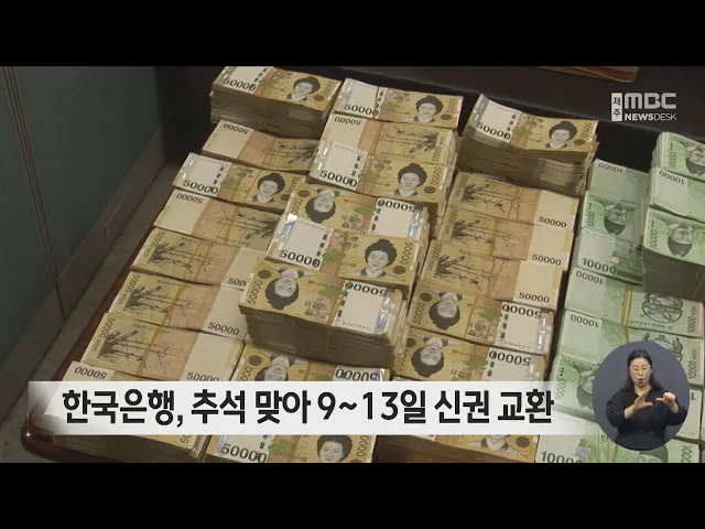 한국은행 제주본부가 추석 명절을 맞아 오는 9일부터 13일까지 닷새 동안 신권을 교환해줍니다. 교환 한도는 5만 원 권은 한 사람당 최고 100만원, 만원 권과 5천 원은 50만 원, 천 원 권은 20만 원입니다. 화폐 교환 시간은 오전 9시부터 오후 4시까지며 이 기간에 손상된 화폐와 동전 교환 업무는 일시적으로 중단합니다....