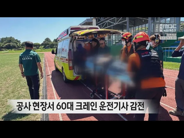 오늘 오후 1시 10분쯤 서귀포시 성산읍의 한 관급공사 현장에서 60대 크레인 운전기사가 감전되는 사고가 발생했습니다. 운전기사는 소방헬기를 타고 화상전문병원으로 옮겨져 치료를 받고 있습니다. 경찰은 크레인이 바람에 흔들려 고압선을 건드렸는데, 운전기사가 크레인에 올라 시동을 끄는 과정에서 감전됐다는 관계자...