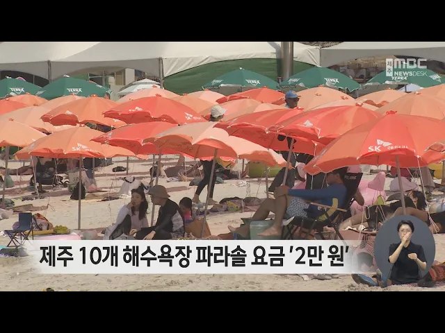 제주지역 10개 해수욕장의 파라솔 요금이 2만 원으로 낮춰졌습니다. 제주도는관광 이미지 개선을 위해 마을회 등과 협의를 거쳐 도내 12개 해수욕장 가운데 중문과 곽지를 제외한 10개 해수욕장에서파라솔 이용 요금을 2만 원에 맞췄습니다. 함덕은 4만 3천 원에 절반 가량, 삼양과 화순 등도 만 원 정도 낮췄습니다. ...