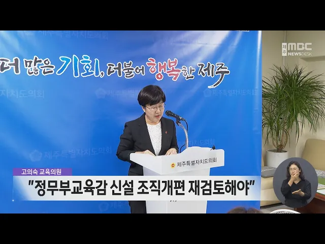 정무부교육감 자리를 새로 만드는 제주도교육청 조직개편 추진에 대해 고의숙 교육의원이 전면 재검토를 촉구했습니다.고 의원은 제주교육의 백년대계를 위한중차대한 일임에도 불구하고,도교육청이 3개월의 짧은 용역만 하고충분한 의견 수렴도 없이속전속결로 밀어붙였다고 지적했습니다.또 조직 개편의 정당성을 확보한 ...