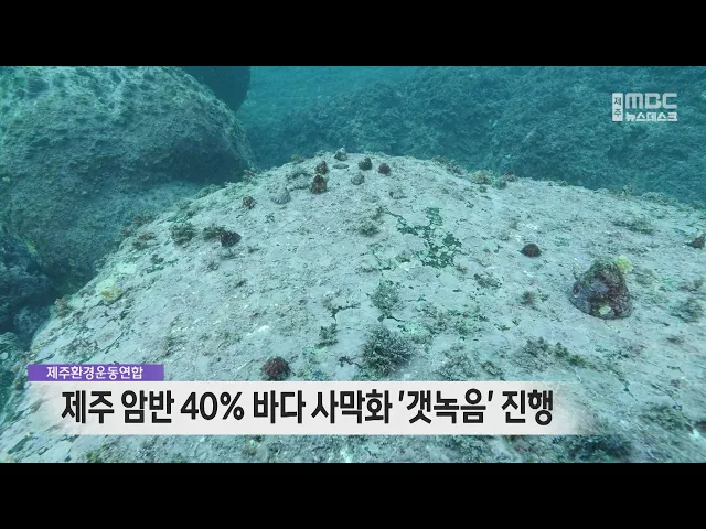 제주 바다 암반의 절반 가까이에서사막화 현상인 갯녹음이 진행 중인 것으로 조사됐습니다.제주참여운동연합에 따르면,제주도 전체 암반의 40%에 달하는 공간에서암반에 서식하는 해조류가 사라지고바위가 하얗게 변하는 갯녹음이 확인됐다고 밝혔습니다.갯녹음으로 해조류가 급감하면서우뭇가사리의 경우 2011년 대비 전체...