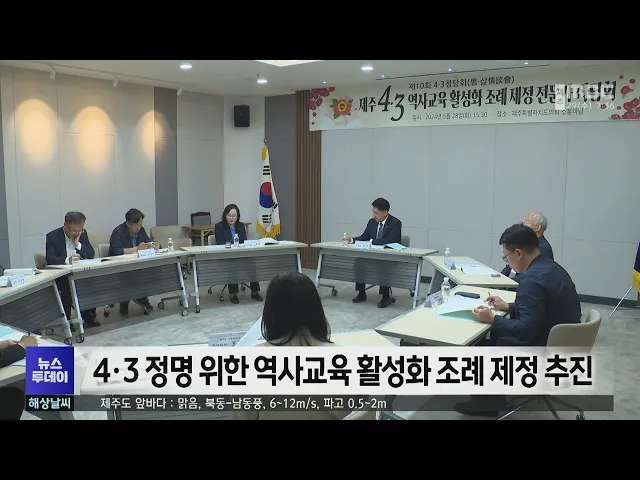제주4·3의 올바른 이름을 찾기 위한역사 교육 조례 제정이 추진됩니다.제주도의회 4.3특별위원회는도의회에서제주4.3 역사교육 활성화 조례 제정전문가 좌담회를 열고,학교 위주의 4.3교육에서 벗어나지역 사회 내에서 종합적이고체계적인 교육이 마련돼야 한다고뜻을 모았습니다.해당 조례안에는4.3 역사교육에 대한 정의...