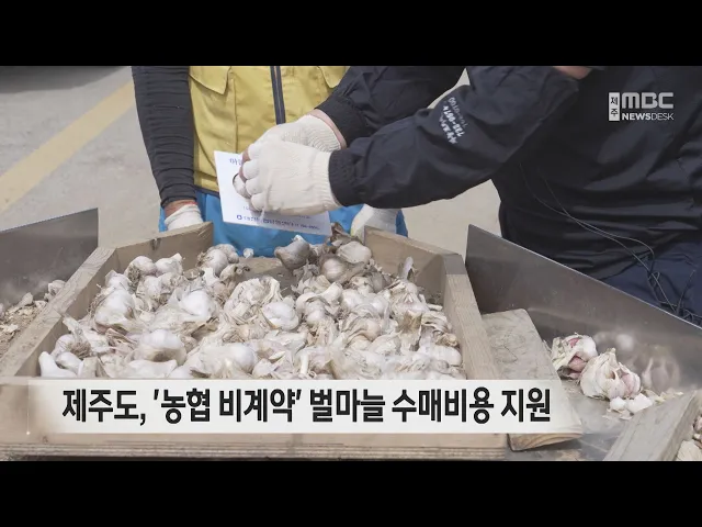 겨울철 잦은 비로 마늘이 갈라지는 벌마늘 피해와 관련해 제주도가 농협과 계약하지 않은 피해 농가의 수매 비용을 지원합니다. 제주도는 지역농협이 계약하지 않은 농가의 벌마늘을 수매할 경우 킬로그램 당 720원을 지원하겠다고 밝혔습니다. 올해 제주산 마늘의 절반 가량은 벌마늘 피해를 입었는데 상인들이 벌마늘...