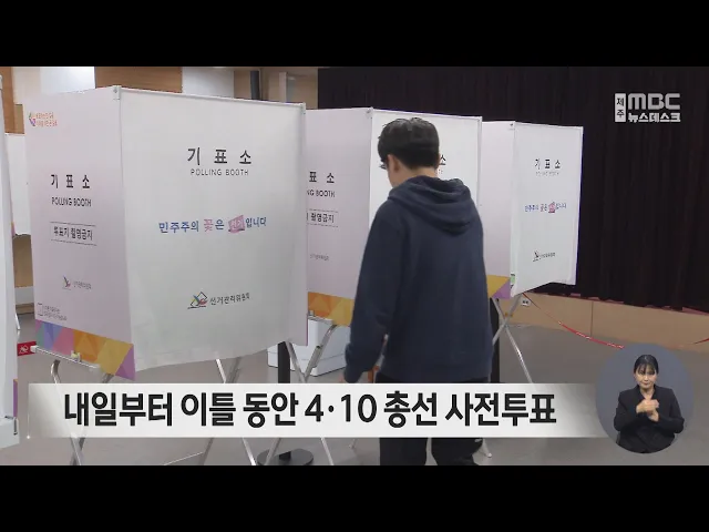 제22대 국회의원 선거 사전투표가 내일(5일)부터 이틀 동안 실시됩니다. 사전투표는 오전 6시부터 오후 6시까지 거주 지역과 관계없이 가까운 사전투표소에서 할 수 있으며 사진이 첨부된 신분증을 가지고 가야합니다. 제주에서는 43개의 사전투표소가 운영되며 투표소 위치는 중앙선관위 홈페이지를 통해 확인할 수 있습니...