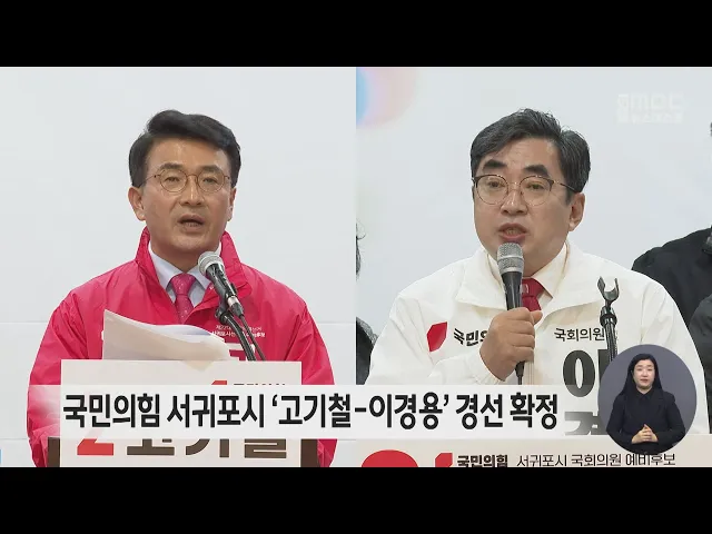 국민의힘 서귀포시 선거구가 고기철, 이경용 후보의 경선으로 치러집니다. 국민의힘 공천관리위원회는오늘 22개 선거구에 대한 경선 후보자를 발표하면서 서귀포시 선거구에고기철, 이경용 후보를 경선 후보자로 결정했습니다. 경선은 당원 20%, 시민 80%의 여론조사를 통해 결정되며 빠르면 이달말쯤 결과가 나올 전망입니...