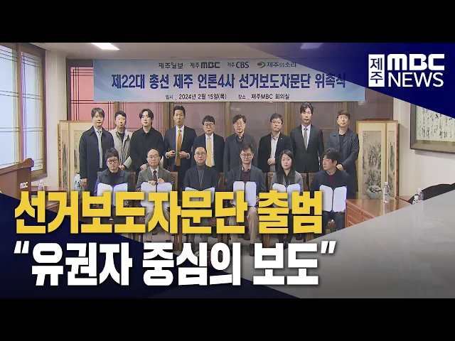 ◀ 앵 커 ▶국회의원 선거가 이제 두 달도 채 남지 않으면서 선거 보도도 쏟아지고 있는데요. 제주MBC 등 언론4사는 선거보도자문단을 꾸리고,유권자 중심의 선거 보도를 하기로 뜻을 모았습니다. 이소현 기자가 보도합니다. ◀ 리포트 ▶여.야의 공천 작업이 본격화되면서과열 조짐을 보이고 있는 제주지역 선거판. 예비 후보...