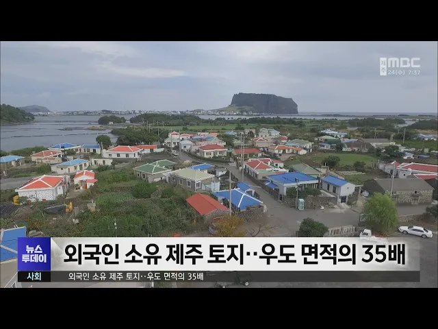 외국인들이 소유한 제주 지역의 토지가우도 면적의 35배에 이르는 것으로 나타났습니다. 국민의힘 홍석준 국회의원이국토교통부에서 받은 자료에 따르면,올해 초 기준 외국인이 소유한 제주도 토지는 2천181만여㎡로 우도 면적의 35배에 이르며전체 공시지가는 5천817억 원입니다. 전체 토지 가운데외국인 토지 보유 비율...
