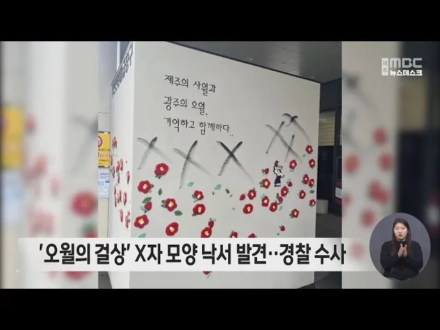 제주4.3과 5.18민주화운동을 함께 기억하기 위해 조성된 오월의 걸상 조형물에 낙서가 발견돼 경찰이 수사에 나섰습니다.서귀포시는지난 19일, 조형물 벽면 등에 엑스자 모양의 낙서가 다수 발견돼 경찰에 신고했다고 밝혔습니다. CCTV에는 당일 새벽 2시쯤중년 남성이 낙설를 하는 장면이 촬영됐으며근처에서는 구두약이 ...