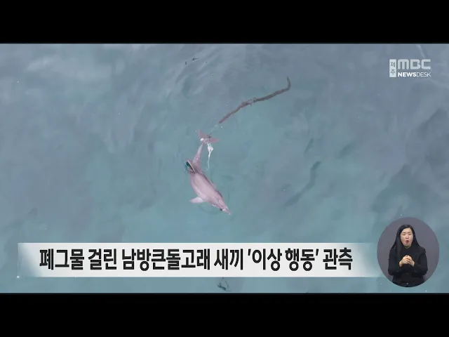 폐그물이 걸린 남방큰돌고래 새끼가이상 행동을 보여 구조가 시급하다는 의견이 나왔습니다. 제주대학교 돌고래 연구팀 등은 어제(21일) 낮 서귀포시 대정읍 앞바다에서 관측된새끼 돌고래가 동물이 극심한 스트레스를 받을 때 나타나는 정형 행동을 보였다고 밝혔습니다. 김병엽 교수는 입과 꼬리에 걸린 폐그물로 인해 허...