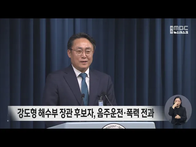 해양수산부 장관 후보자로 지명된제주 출신 강도형 전 한국해양과학기술원장의음주 운전과 폭력 전과가 확인돼논란이 예상됩니다. 더불어민주당 김두관 의원이경찰청으로부터 받은 범죄 경력 조회 결과에 따르면강 후보자는 2004년 음주 운전으로 벌금 150만 원을처분 받았고,그보다 앞선 1999년에는 폭행으로 30만 원을 ...