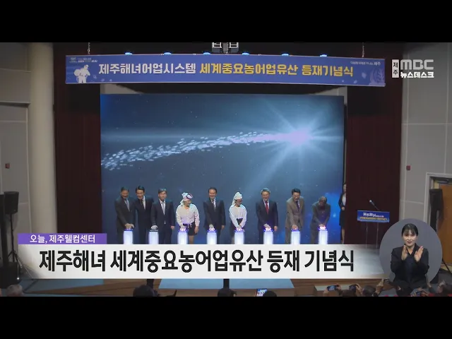 제주 해녀어업의 세계중요농업유산 등재기념식이 제주 웰컴센터에서 열렸습니다. 이번 기념식에서 제주도는지속가능한 해녀어업 육성을 위해신규해녀 양성과 복지, 홈스테이 확대 등의정책을 강화하겠다고 밝혔습니다. 다음달에는국가중요어업유산 등재를 알리기 위해제1회 국가중요어업유산 축제를 개최합니다.