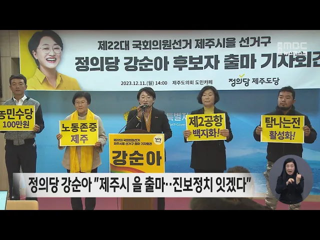 강순아 정의당 제주도당 부위원장이내년 총선, 제주시 을 선거구 출마를 공식 선언했습니다. 강 부위원장은제주도의회 도민카페에서출마 기자회견을 열고제주 지역 진보정치 2세대로새로운 진보 정치를 열어가겠다고 밝혔습니다. 또, 그동안 정의당이 실망을 드렸지만 진보의 가치를 포기할 수 없다며, 모든 진보 세력의 힘...